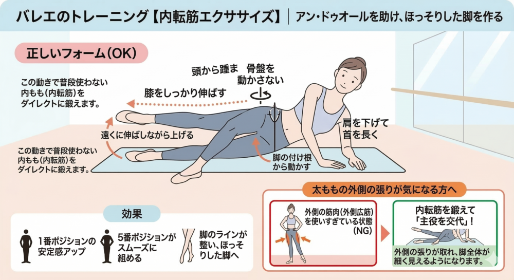 バレリーナ特有の「内側から開いた脚」を作るには、内転筋の強化が欠かせません。横向きに寝て、上の脚を前にクロスさせ、下の脚を上下に動かすエクササイズがおすすめです。