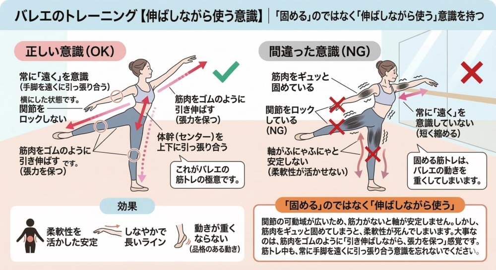 「鍛える」と「緩める」をセットで行うことで、初めてしなやかで強い、バレリーナの筋肉が作られます。