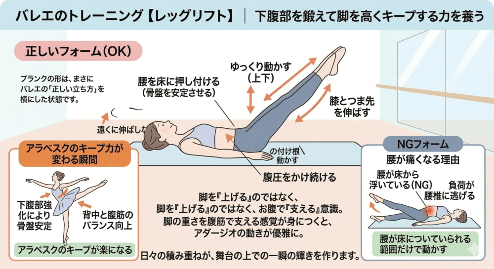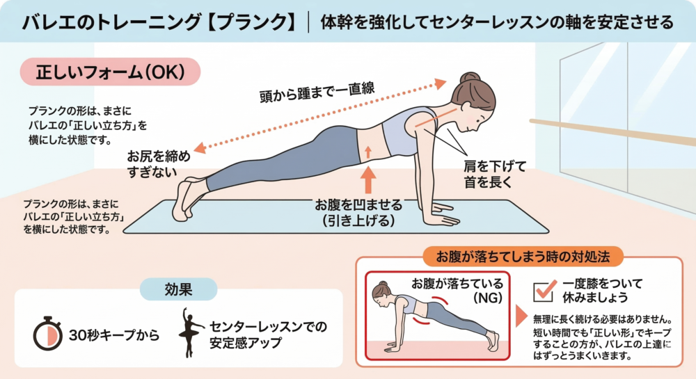 プランクは、バレエに必要な「動かない力」を養うのに最適なトレーニングです。