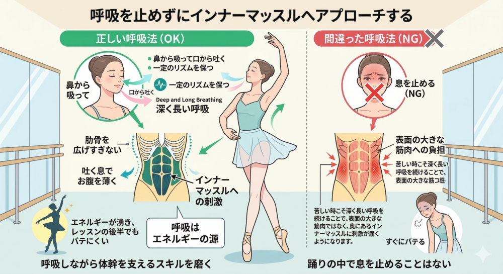 プランク中に息を止めてしまうと、表面の筋肉ばかりが固まってしまいます。バレエで使いたいのは、呼吸をしながらでも体を支え続けられる深い部分の筋肉です。
