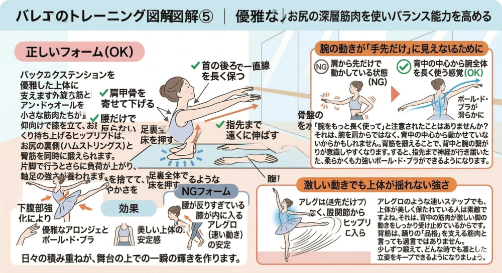 脚の重さを腹筋で支える感覚が身につくと、アダージオの動きがぐんと優雅になります。